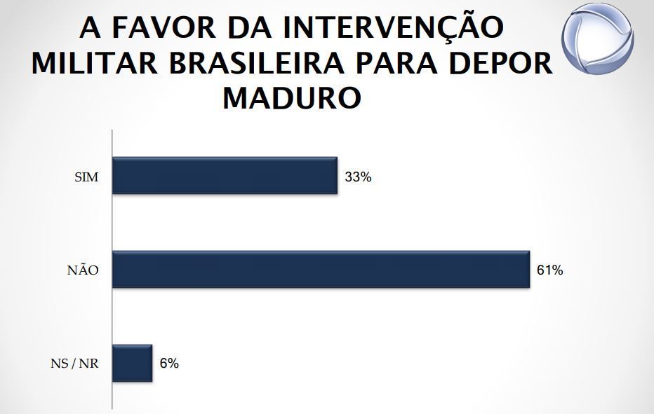 A maioria dos brasileiros (61%) afirma ser contra uma intervenção militar brasileira na tentativa de derrubar Nicolás Maduro do comando da Venezuela, segundo uma pesquisa divulgada nesta quarta-feira (1º) pelo instituto RealTime Big Data.