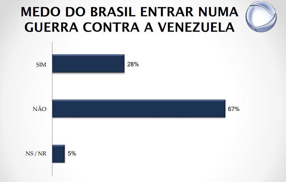 O estudo aponta ainda que 67% da população diz não ter medo de que o Brasil entre em uma guerra contra a Venezuela. Outros 28% manifestam temor pela possibilidade e 5% disseram não saber ou preferiram não opinar sobre a questão.